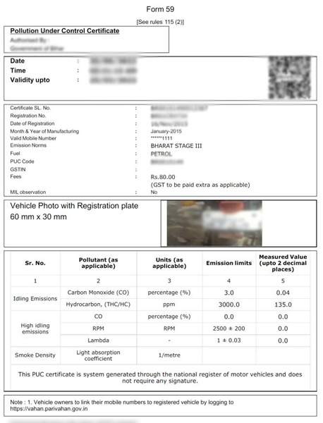 PUC Details: The certificate includes detailed information about the emission test and the results.