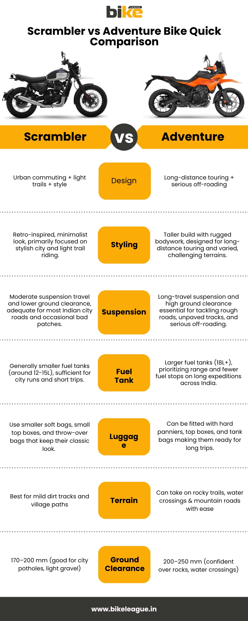Scramblers have a classic, simple look inspired by rally bikes from the 1960s and 70s. They feature round headlights, ribbed seats, knobby tyres, and exposed frames, which attract city riders who want a unique bike. Adventure bikes, on the other hand, look rugged and ready for long trips, with tall windscreens, beak-shaped fairings, handguards, and tank pads. These features make them suitable for tough journeys, such as crossing the Himalayan passes or riding through deserts.
